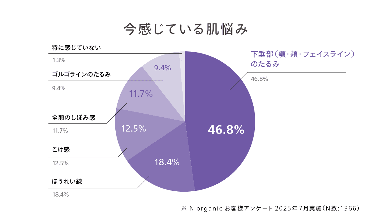 私たちNラボが実施した1,000名以上を対象とするユーザーアンケートとインタビューでは、エイジングによる肌悩みの中で最も多く挙がったのが「下垂部(顎・頬・フェイスライン)の形状変化」でした。輪郭がくずれたり、あご下にたるみが出てきたりといった悩みが約半数を占めています。