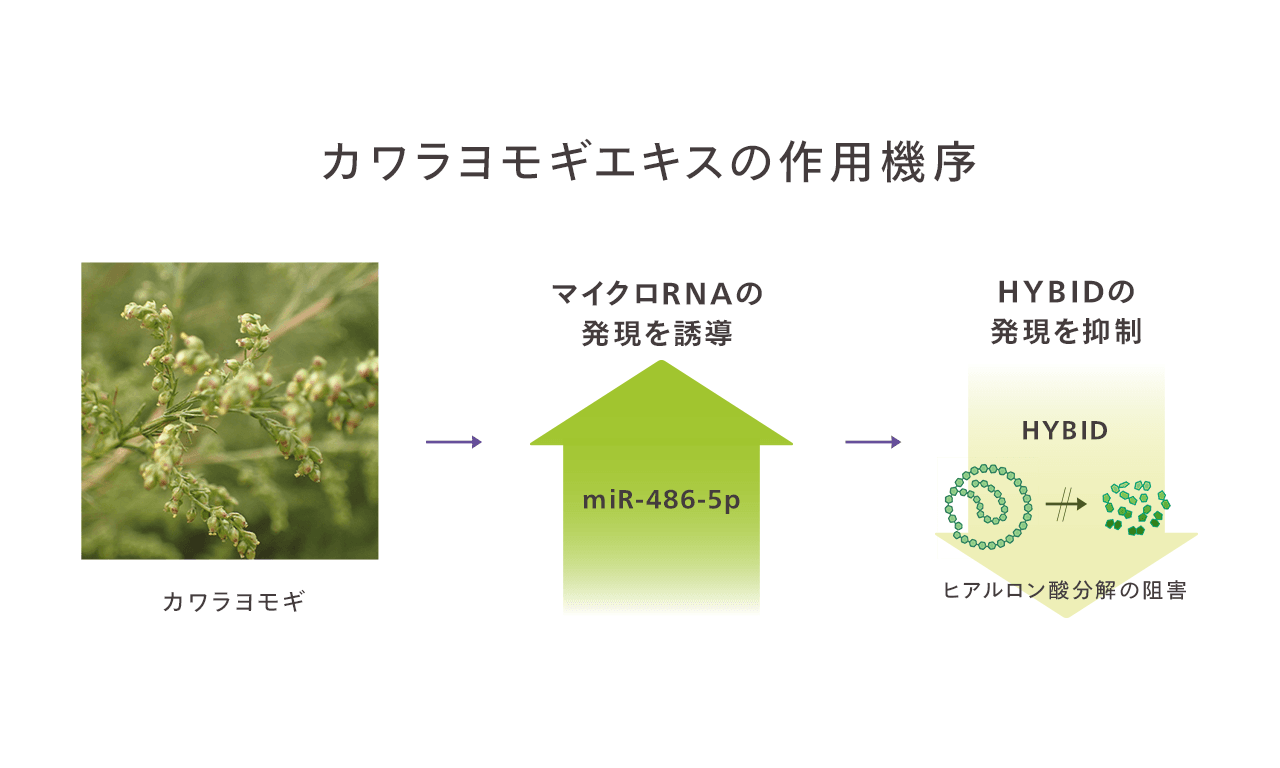 カワラヨモギ花由来エキスがmiR-486-5pの発現を誘導し、その結果としてHYBIDの発現を抑制。これによりヒアルロン酸分解が抑えられ、真皮ヒアルロン酸を守る新しい仕組みが確認された。