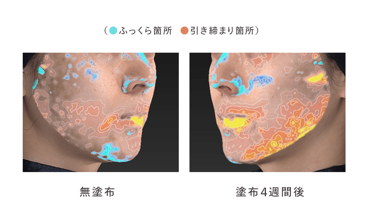 半顔に製剤を4週間塗布した試験の結果画像。ブルーがパンプアップ(ふっくらした部分)、オレンジが引き締まった部分です。製剤使用側にはほうれい線などで凹みやすい小鼻横にパンプアップが見られ、ゆるみやすいフェイスラインには引き締まりが確認できました。