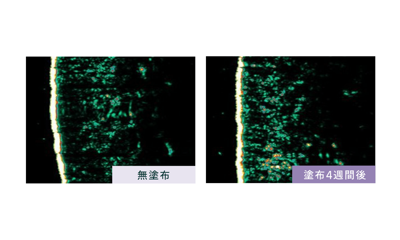 カワラヨモギ花由来エキスを配合した製剤を無塗布/塗布を比較。塗布後は真皮の厚みが増し、コラーゲンやエラスチンなどの構造が密になっていることが確認された。
