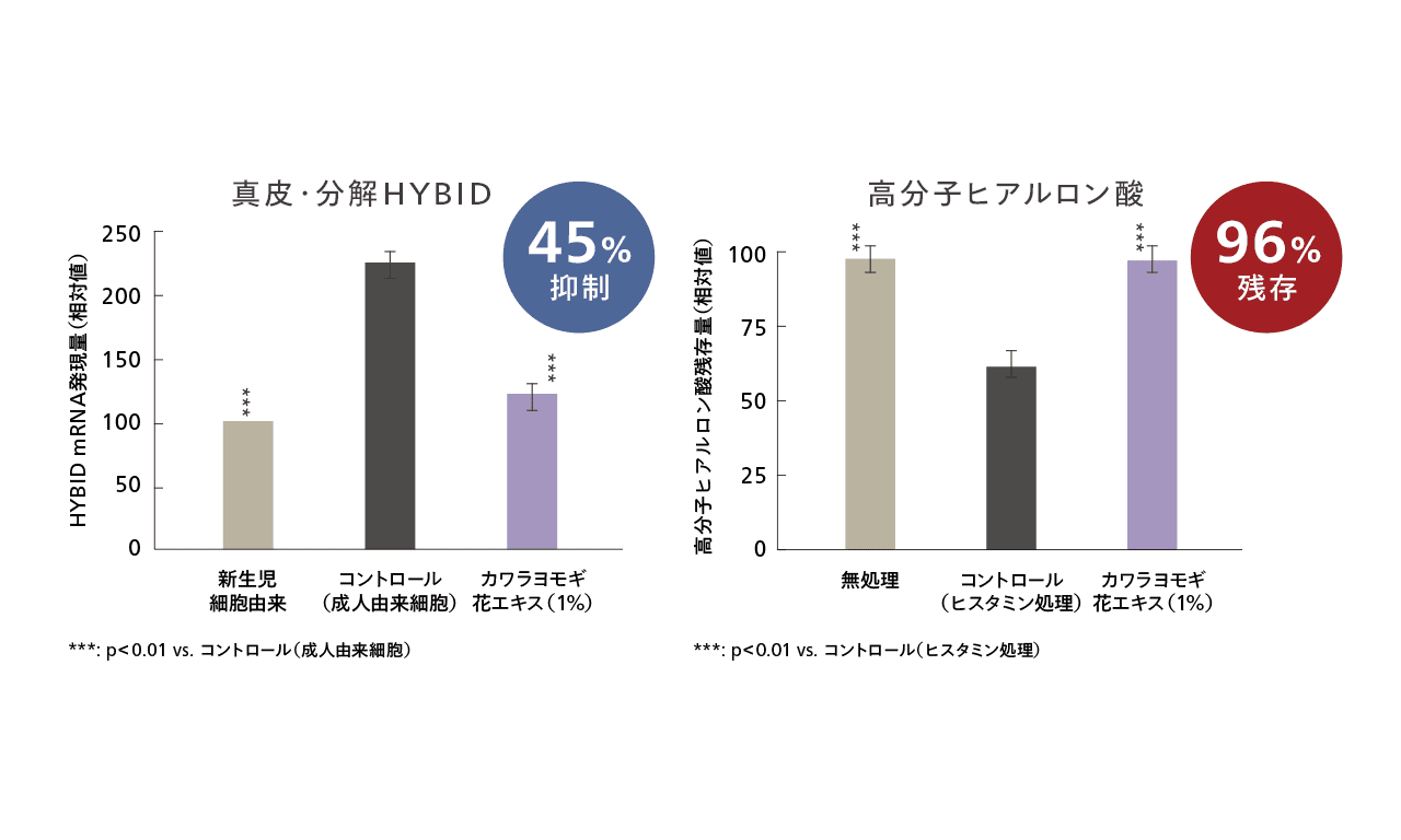 成人由来線維芽細胞において高まったHYBID発現が、カワラヨモギ花由来エキス(1%)の添加によって45%抑制された。右図:炎症刺激を与えた線維芽細胞では高分子ヒアルロン酸の分解が進みましたが、カワラヨモギ花由来エキス(1%)の添加により、その減少が抑制され96%残存した。
